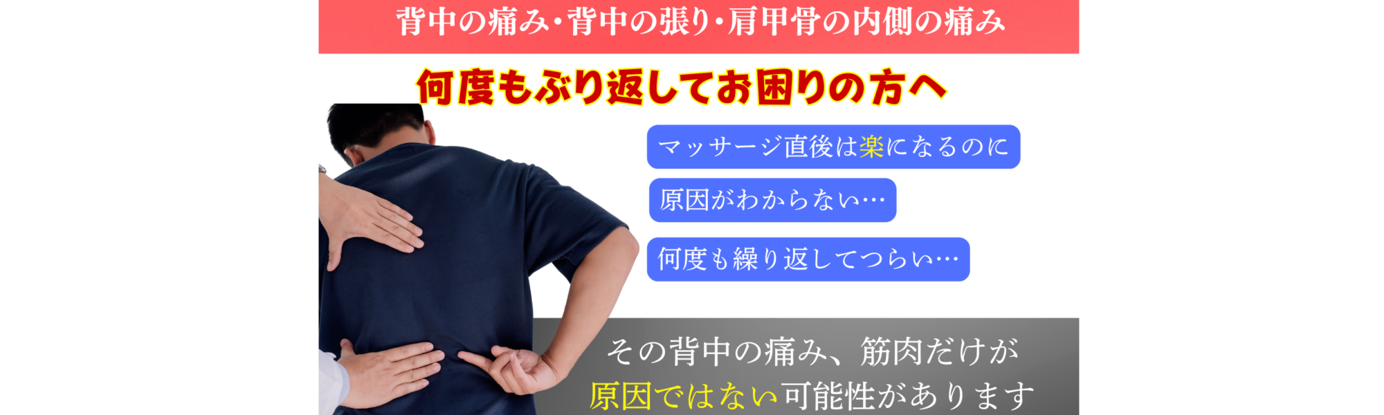 背中の痛みや張り、肩甲骨周囲の痛みでお困りの方は、お気軽にご相談ください。