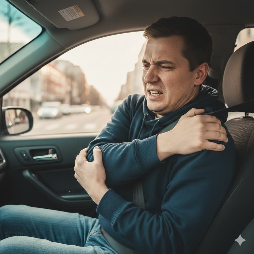 「シートベルトを取ろうと後ろに手を伸ばした瞬間、肩が止まる」