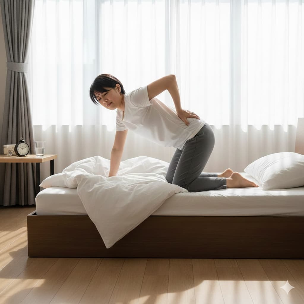 特に、仙腸関節・股関節・腰椎の動き が硬くなると、寝起きの腰がスムーズに伸びなくなりやすいのが特徴です。