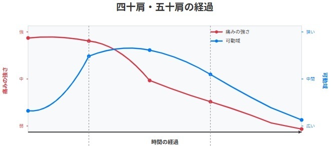 四十肩・五十肩は、多くの場合「炎症期 → 拘縮期 → 回復期」という経過をたどります。