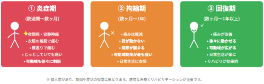 四十肩・五十肩は、多くの場合「炎症期 → 拘縮期 → 回復期」という経過をたどります。